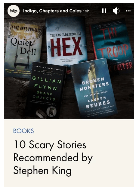 Even when your creepy algorithms freaked me out, I stuck with you in our dysfunctional relationship. On October 4, 2021, Stephen King posted this on Twitter, sandwiched between a sad story and ad for a chocolate bar, and I “engaged” in it somehow. It didn’t take long before I started seeing ads like this on my Facebook wall: