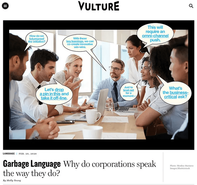 Until now, Google Translate’s been working pretty well. We translate words in more than 100 languages but one of them wasn’t Garbage Language. That’s the phrase that writers like Molly Young, in Vulture magazine, and Uncanny Valley author Anna Wiener use to describe this mad phenomenon swirling around our boardroom tables and infecting our emails and conference calls.