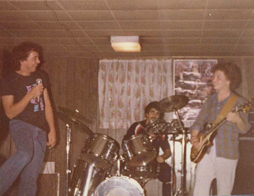 Banging away on my Stewart chrome drums with Greg Rumpel (left) and Mark Gambini, two thirds of the group that we called Freewill, after a Rush song.