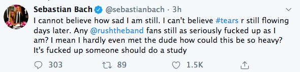 The pain is real, but the conventions and the rites of this particular passage feel like they haven’t been invented yet. Have they? Are there any grief counselors who deal with mourning the death of an idol? It’s something that singer-songwriter Sebastian Bach struggled with and asked on Twitter.