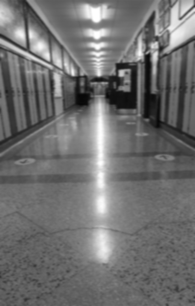 Where is everyone? The high school hall should be teeming but it’s empty, bereft of life.